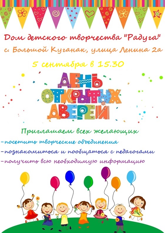 И ПО ЗАМЕЧАТЕЛЬНОЙ ТРАДИЦИИ МОБУ ДО ДДТ "РАДУГА"ШИРОКО РАСПАХНЕТ СВОИ ДВЕРИ ДЛЯ ВСЕХ ЖЕЛАЮЩИХ 5 СЕНТЯБРЯ , НА ПРАЗДНИКЕ "ДЕНЬ ОТКРЫТЫХ ДВЕРЕЙ".
