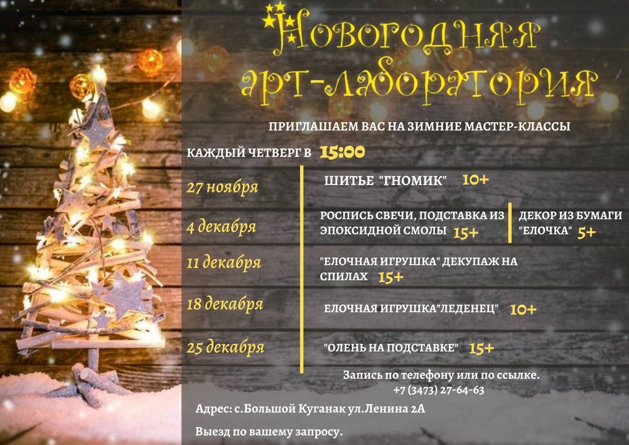 Дополнительно: возможен выезд по вашему запросу.Не упустите возможность провести время творчески и с пользой, создать неповторимые новогодние поделки и зарядиться праздничным настроением! Ждём вас на мастер-классах!